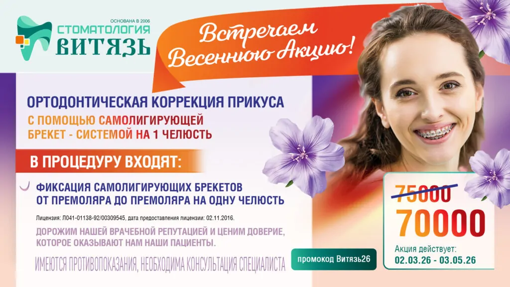 Коррекция прикуса самолигирующей брекет-системой на 1 челюсть — 70 000 р.(вместо 75 000 р.)