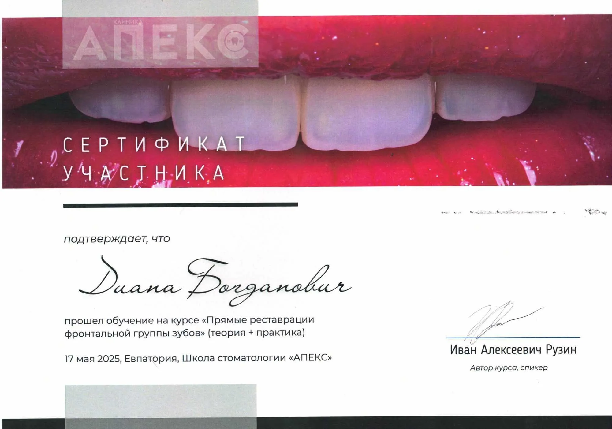 ФГАОУ ВО «Крымский государственный медицинский университет имени С.И. Георгиевского», год окончания 2003, Сертификат №490 врача-специалиста по специальности Терапевтическая стоматология